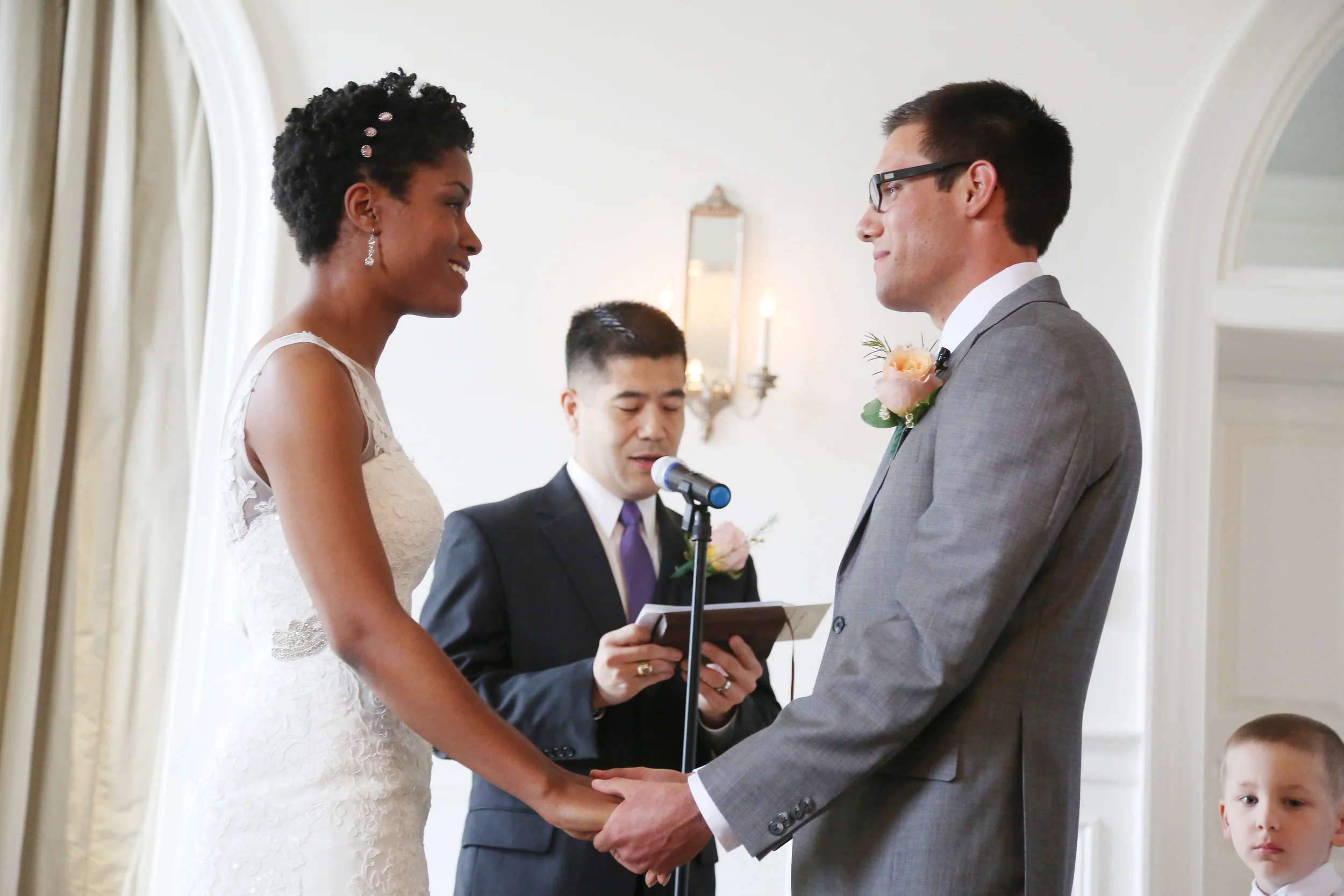 Brandon and Marlena were married in April at Keswick Hall (which was named a Forbes Five-Star resort this year!) Since Brandon happened to be the activities director at Keswick, he knew all of the most picturesque views of the property. A week before the wedding, Brandon took Marlena and I on a tour of the large property which boasts a golf course, a creek, a willow tree, woodsy areas, manicured gardens, a pool, a little garden house, as well as the beautiful estate building itself which makes an epic backdrop for wedding day portraits. As we toured around, we planned out all of the spots where we would do portraits after their late morning ceremony. When the morning of the wedding arrived, it was overcast, and eventually a steady rain set in over the chairs set up on the patio for the ceremony. I have to admit, I was a little disappointed that our grand views of the property we had planned as our portraits backdrop would have to be moved…until Brandon turned this notion on its head for me… Just before the ceremony, Brandon and Marlena met up in a quiet hallway, separated by a folding screen. They held hands around the barrier, taking turns praying out loud. The wedding coordinator had just informed us that it was raining too hard and that the ceremony would be moved inside. I’ll never forget when, while holding hands with his bride around the screen, Brandon said, with his voice confident and filled with joy, “Thank you, God, for the rain! Let it help things grow, and let it help our love also grow.” Not “Despite the rain….” but “Thank you for the rain!” At that moment, Brandon totally flipped the script for me, and I saw everything in a different light. The rain was beautiful. Everything about this day was perfect. This was their wedding day, and they were thankful for everything, even the rain itself. I felt very privileged to be right next to them in the hallway in that moment, taking photos. Sometimes as a wedding photographer, I get to witness such powerful, private moments between people, it is overwhelming. I try to disappear in these moments and observe and document, in a way that is not distracting. After a beautiful ceremony, where everyone sang together, we found a cozy, covered porch to do family photos. Then we headed over to a lovely arbor by the pool house, the latticework dripping with purple wisteria, to do our portraits of the bride and groom. It was outside, yet covered. That’s not to say we didn’t experience a few raindrops on our heads, but none of us cared a bit! Everything turned out beautiful, and once we got back to the reception inside, their friends and family proved to be more than ready to light up the dance floor at the early hour of noon. Brandon and Marlena walked into the room to “Uptown Funk” and it was pretty much a nonstop dance party from there on out. It’s a landmark year for Brandon and Marlena. Not only were they married in 2015, but Marlena has also just graduated from UVA School of Medicine. I know these two have a very bright future ahead…I’m so excited for them!