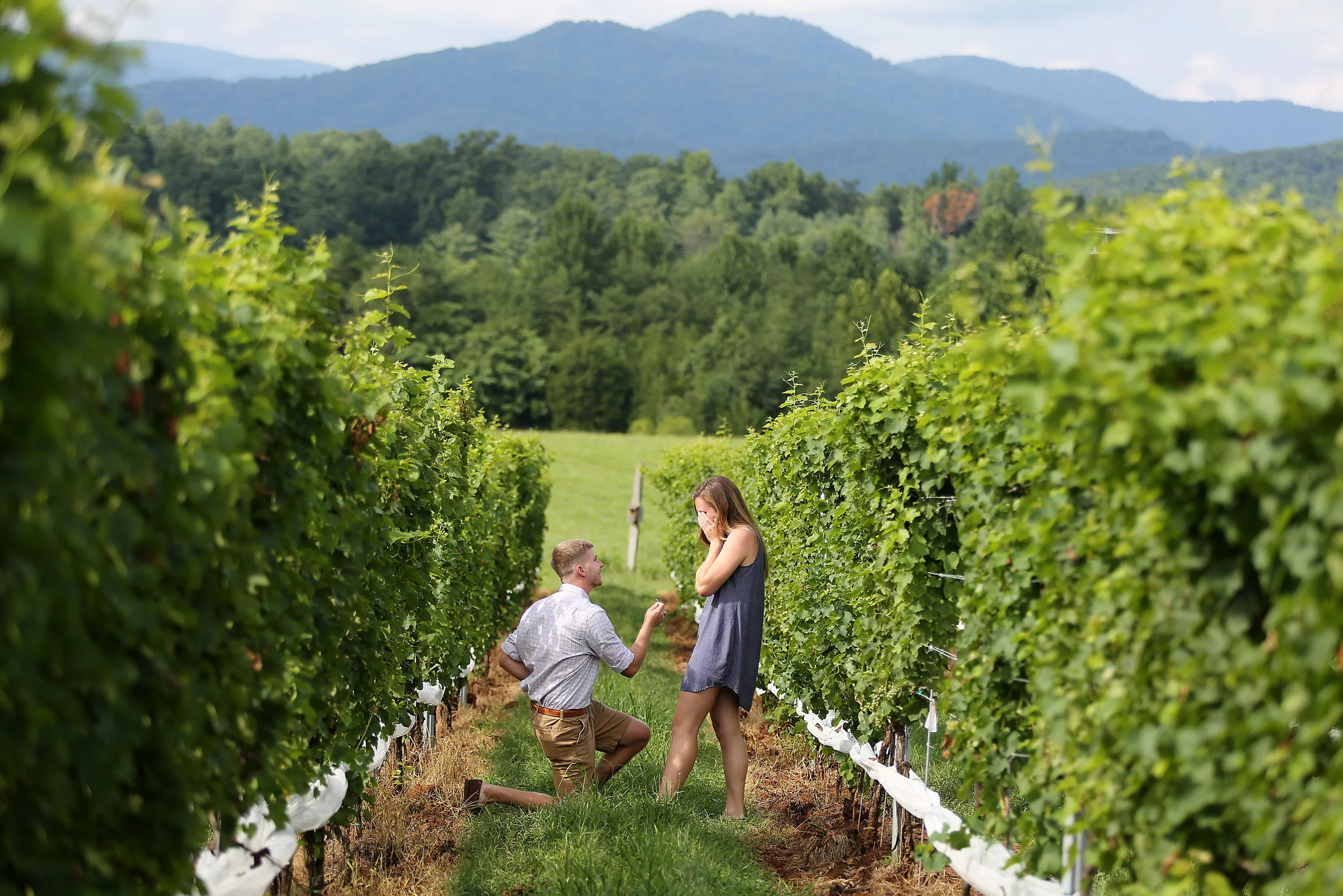 I was so excited when Cody contacted me to ask if I would photograph him as he proposed to his girlfriend Mady at Stinson Vineyards, in Crozet, VA. This type of shoot is so fun because there's an element of sneaking around which adds another dimension to the shoot. Cody and I worked it all out ahead of time. I would wait at the edge of the rows of vines pretending to be very interested in photographing close-ups of grapes on the vine, while Cody and Mady finished up a glass of wine at the tasting room. Then, Cody would suggest a walk down the vines...I would follow and be ready for him to drop to a knee and propose! The day arrived and the vineyard had such epic views of the blue ridge mountains, I knew the photos would be epic! As I pretended to photograph grapes (well, I really did photograph the grapes...), I got a little nervous myself, worrying that Mady would figure out what I was up to...but they walked right by me and I followed them secretly, hoping she wouldn't hear my camera's shutter or turn around since we were the ONLY people in the vines (and that might be a little creepy to see someone following you...), but it all went off absolutely without a hitch. Mady didn't notice I had followed them at all, and when Cody dropped to a knee, it was so beautiful. It was an honor to be there as the only witness to see Mady's surprised and overjoyed expression, and all in the most gorgeous setting... They reveled in the moment and when Mady finally started becoming aware of me, snapping away at that point, it was funny to see her realize that Cody had hired me. At one point, someone who worked at the vineyard called through the vineyard "Congratulations!....I literally heard it through the grapevine!" Ha ha ha! I loved that moment! I could shoot a surprise proposal every day, it is so fun!